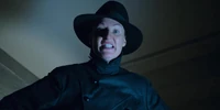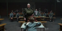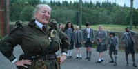 Miss Agatha Trunchbull, or otherwise known as The Trunchbull, is the main antagonist of the Matilda franchise. Miss Trunchbull is depicted as a large, muscular woman who wears her hair in a tight bun. Her outfit is a bottle-green tight pantsuit adorned with a brown belt with a silver buckle. She is a harsh, violent, unstable, misopedist, sociopathic school principal who terrorizes children, and states that she was glad that she was never one. She is also wearing a dress shirt with a necktie as well.
